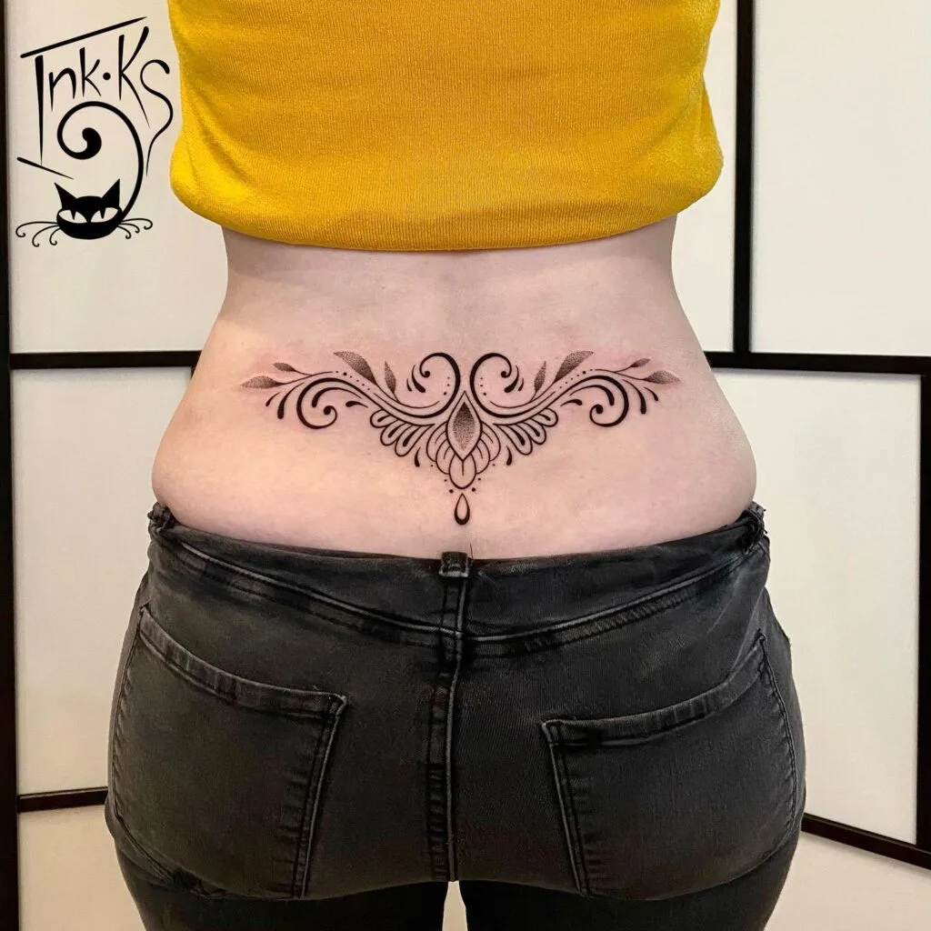 Fine line details and subtle dotwork give the tattoo an airy, elegant quality that flows naturally across the skin. Positioned at the center of the lower back, this design is both graceful and deeply meaningful.