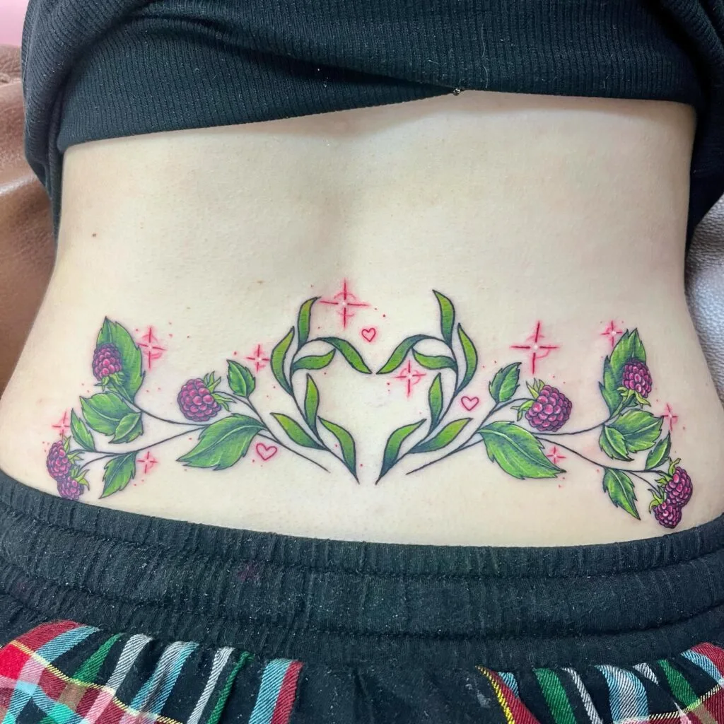 Raspberry Vines and Heart Lower Back Tattoo