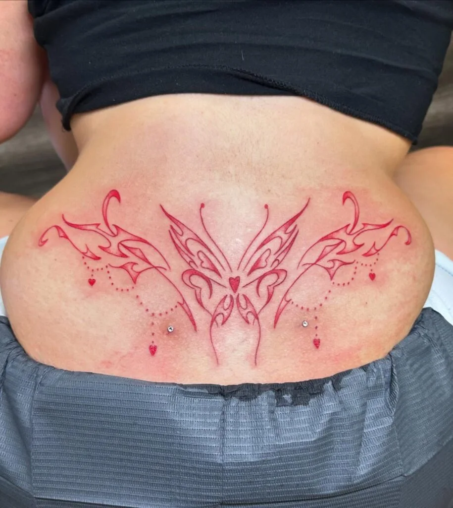 Red Butterfly and Hearts Lower Back Tattoo