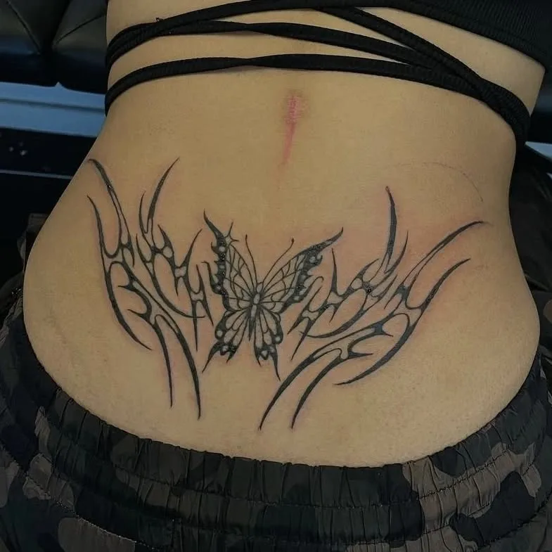 This lower back tattoo combines the elegance of a butterfly with the boldness of tribal-inspired patterns.
